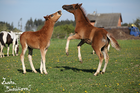 2009, celý kůň, český sportovní pony, dva, hraní, hříbata, hříbě, jaro, na šířku, pastvina, ryzák, skákání, slunečno, vzpínání, |